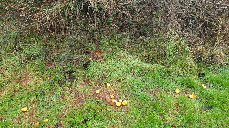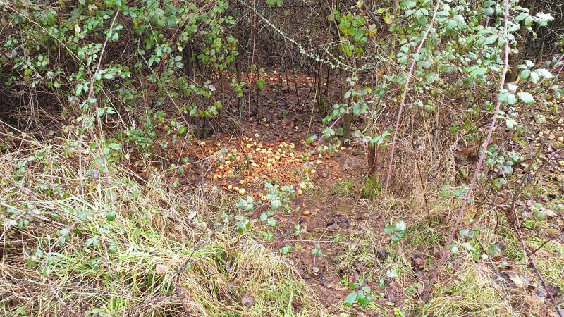 This picture shows rabbit entrances under bramble clustered around European Larch and clearly fruit has been brought closer to this zone. We pop out to the chippy rabbits pop out for an apple.