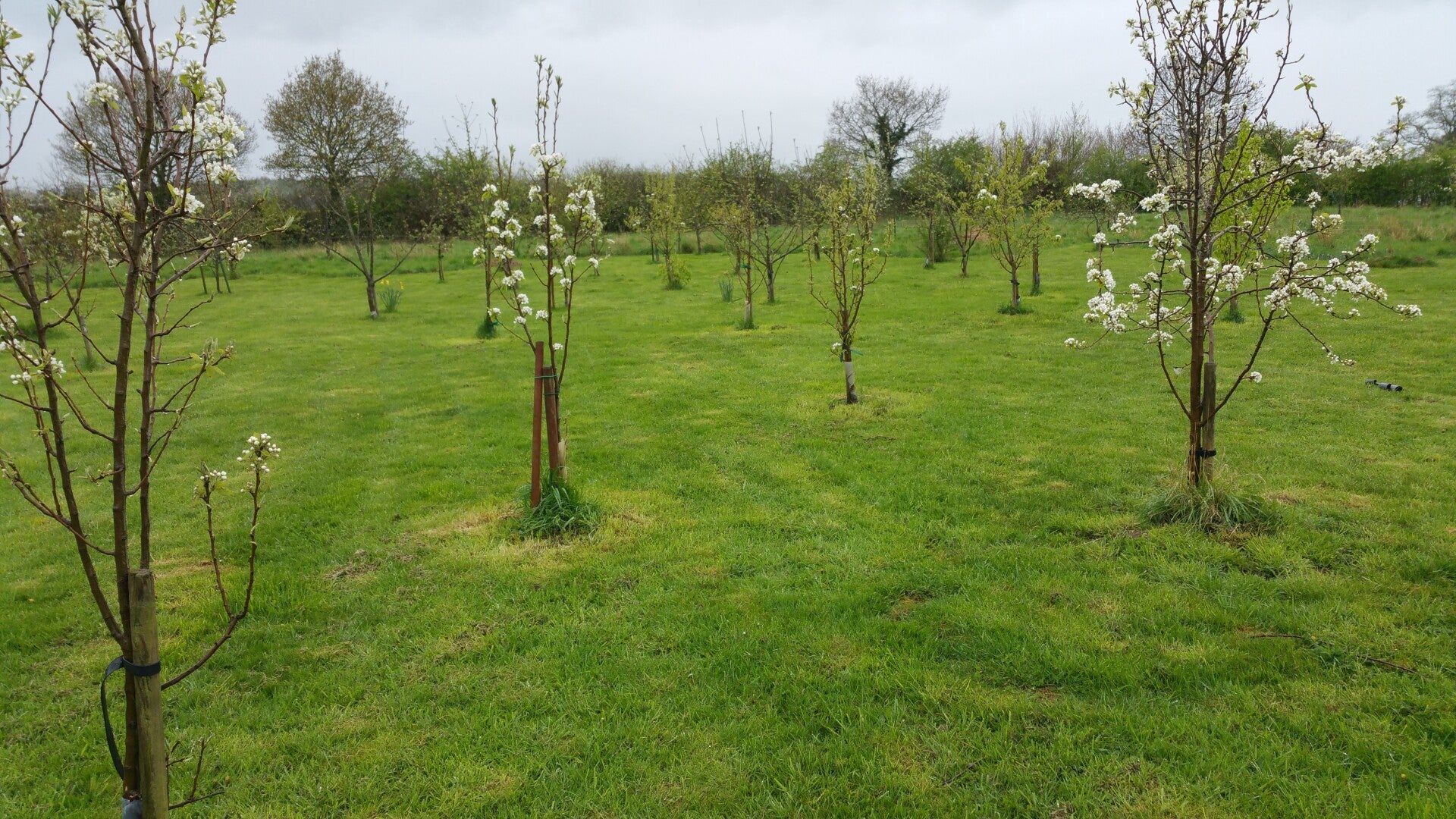 The various stages of plants and their role in creating healthy soil can be evidenced above. The picture on the left shows the boundary hedge and the right the field after 2 years of being left fallow. Although difficult to see, planting of saplings was taking place at this time. Some were only the height of the grass and fast growing plants like doc and thistle that left unchecked outcompeted young fruit trees for light, water and soil nutrients . Their presence was turned into an advantage by circular scything however. This acted as a mulch mat at the base of the tree and gentle landing for fruit when falling off the tree when ripe.
