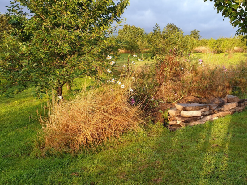 When the five acres of land was acquired it was in a poor ecological state. It had changed from agricultural use to horse grazing over the late twentieth century and had been overgrazed with virtually no humus layer. The challenge and my objective was to restore the soil layer. The role of microbes, small mammals and plants considered by most as weeds were key tools in this process. Interestingly I have found the role of dock and thistle for example essential in establishing a humus layer far quicker than would otherwise have been possible. Fast growing plants (weeds) that can overwhelm other plants, when cut back provide the biomass to help restore soil structure at a higher rate. Stems and leaves are biomass and contribute to holding rainwater as well as when placed strategically homes for a range of small animals.