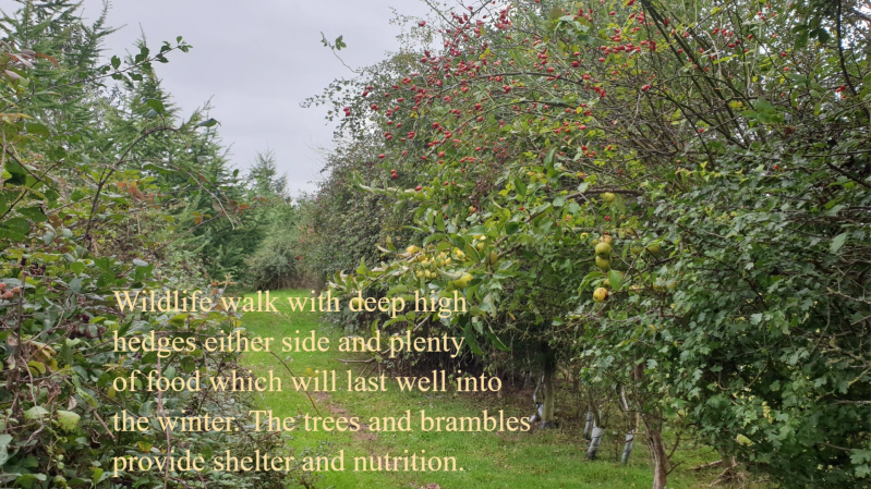 Autumnal walks on the now established paths show a variety of crab apples and rosehips. Still plenty of blackcurrants and the odd damson and plum provide an autumn feast for birds and insects.